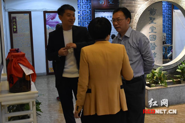 何清湖一行参观了医馆的中医诊疗室、外疗室、健康体检中心、中药煎熬室等机构。李林燊总经理介绍了百杏堂名医馆的概况及新馆的规划,并对何清湖校长、陈栋材处长的莅临表示欢迎。李林燊总经理介绍说,医馆成立3年,目前坐诊名医包括中南大学湘雅医院、湖南中医药大学附属第一医院、湖南中医药大学附属第二医院、湖南省中医药研究院附属医院、长沙市中医院等五家医院离退休名老专家以及梁清华、袁长津、欧阳紫婷、张崇泉、蒋士生、李家邦、肖国士、田道法、李炜、石林阶、陈金莲等四十多位国家级、省级名医,为全患者提供了优质高效的专业中医诊疗服务。医馆重视中医文化氛围营造,中医文化建设已成为行业的典范。