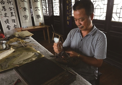 袁小伍11岁便跟着父亲学习盔头制作,如今虽已是知天命之年,却仍然在坚守这一家传技艺。“恒春奇”盔头制作延续了花鼓戏的盔头类型,有雕、刻、挖、嵌、堆、塑、染、绣、扎、贴、胶、漆等手法,二十多道工序。