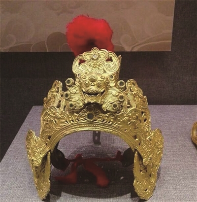 “别看舞台上光彩熠熠的盔头仿佛金属片一般,其实是纸做的。”袁小伍介绍,“恒春奇”盔头的纸袼褙大部分用的就是普通土纸,刷上面粉、明矾、稠稀适当的浆糊,粘贴十八至二十三层,再晾干成纸袼褙,然后根据角色头型大小用泥土加棉花泥塑,并用锤子打烙制胎,再火烙成型……制作一顶盔头,最简单的也要四五天,复杂点的要十多天才能完成。