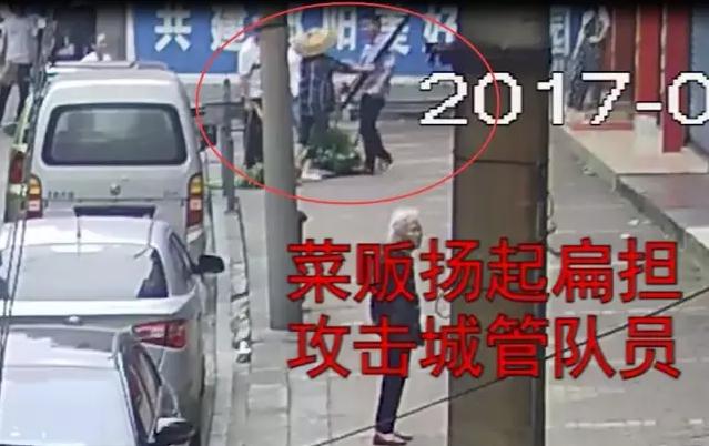 城管劝说菜贩,菜贩不听,拿菜砸城管队员。