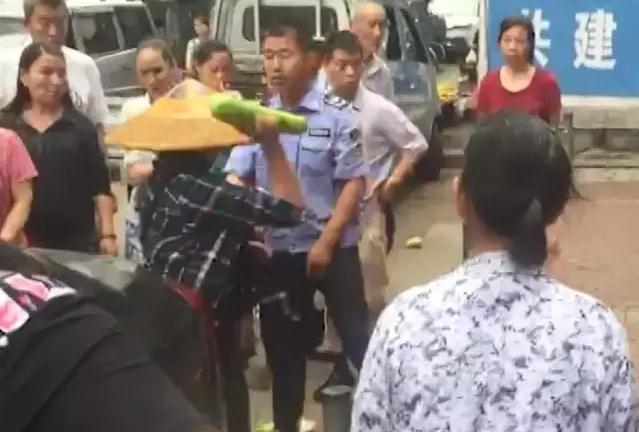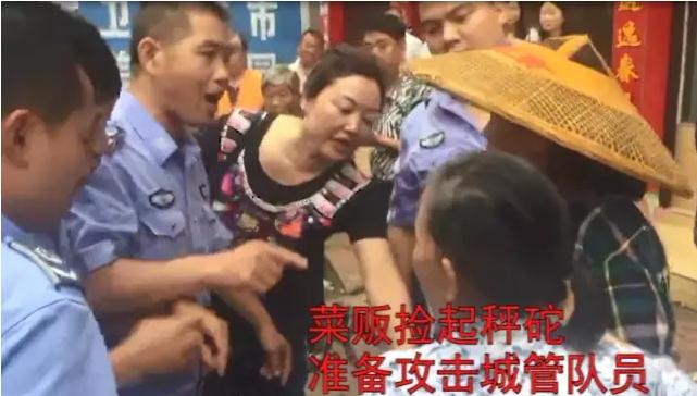 周围群众劝说菜贩收摊回家,菜贩不听,捡起秤坨准备攻击,被群众拦阻。