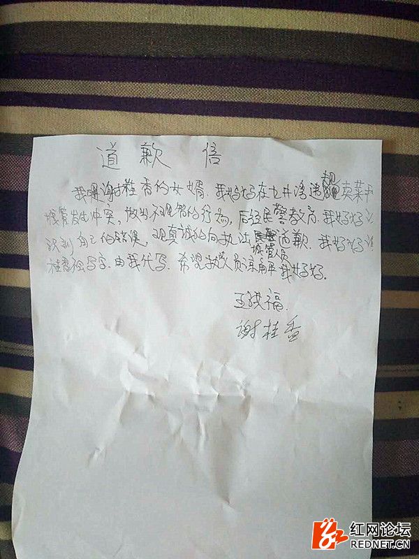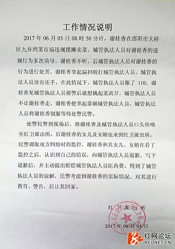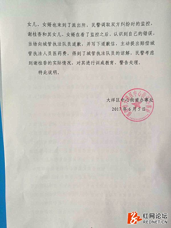 处警民警到现场后将双方当事人口头传唤至大祥区红卫派出所,后谢某的女儿、女婿也来到了派出所,民警调取当时的治安监控,在事实面前,当事人谢某认识到自己的错误,当场向城管执法队员道歉,并让其女婿代为写下道歉信(本人按手模),主动提出赔偿城管执法人员医药费,得到城管队员的谅解并婉拒了赔偿,派出所对谢某进行了训戒教育和警告处理。