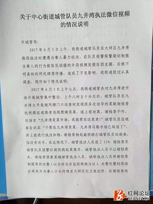 当天上午7时起,中心街道城管办对九井湾地段开展日常巡查管控工作。上午8时50分左右,城管队员伍某、周某在九井湾太平巷避风塘门口巡查时,发现经多次劝导的菜贩谢某(女)依然在路旁违规摆摊卖菜,遂上前劝离。谢某不听劝阻,于是城管队员对其依法进行处置。谢某拿起扁担殴打了城管队员伍某(有治安监控视频为证), 城管队员伍某没有还手并打110报警。谢某见城管队员报警后就想挑菜离开,被城管队员阻止,谢某便拿菜砸城管执法人员伍某、周某,城管队员遂扯住其菜担并拉住其本人,冲突过程被在场市民拍下视频。