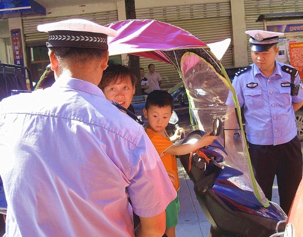 交警在对一辆违规上路的摩托车进行查处。