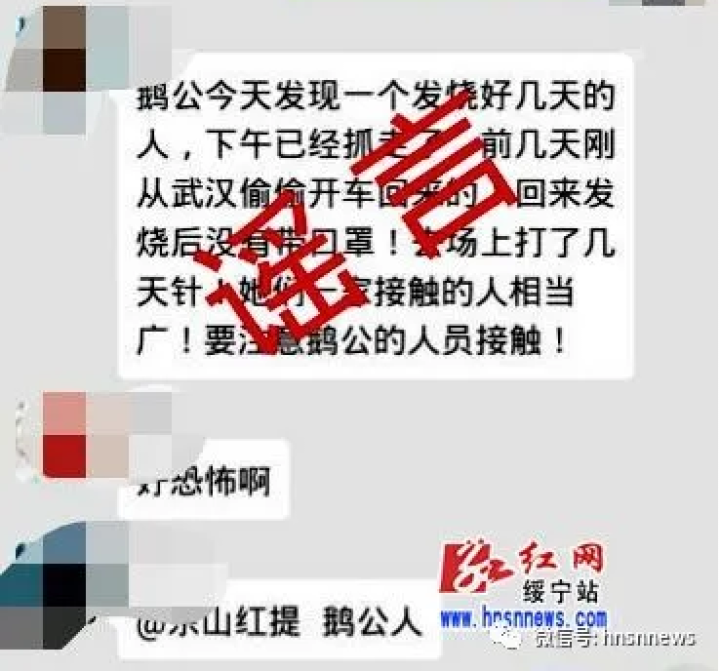 谣言四:网传消息称“鹅公今天发现一个发烧好几天的人,下午已经抓走了,前几天刚从武汉偷偷开车回来的!回来发烧后没有带口罩!去场上打了几天针!她们一家接触的人相当广!要注意鹅公的人员接触!”