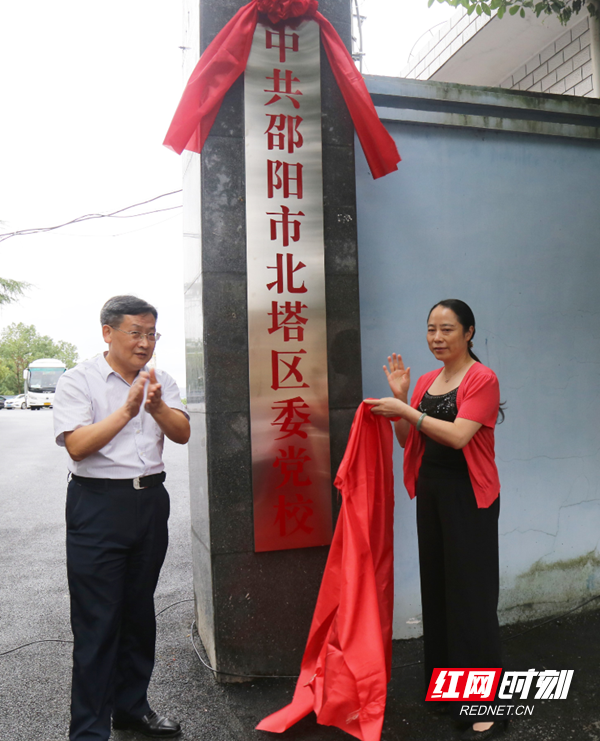 上午9时10分许,随着大红绸布缓缓揭开,“中共邵阳市北塔区委党校”跃然面世,在绿树红花映衬下分外夺目。