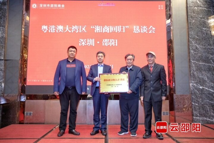 市委书记严华向深圳市邵阳商会颁授“邵阳市驻大湾区人才工作站”工作牌。
