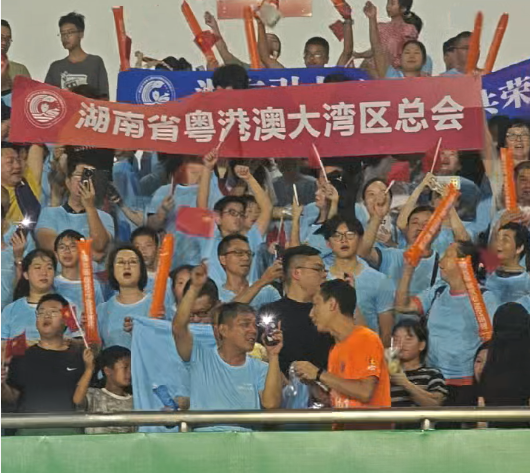 岭南湖南都是家乡,74岁的秦爷爷是土生土长的邵阳人,却在深圳生活了20多年,他橙色邵阳队球衣外面套着大湾区湖南人队的淡蓝色球衣,站在看台上,既为大湾区湖南人队加油,也为邵阳队呐喊,他说:“里是邵阳的根,外是大湾区的情!”