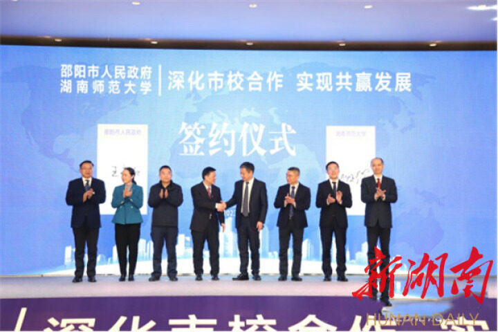 当天下午,邵阳市人民政府与湖南师范大学签订战略合作框架协议。这是双方开展“深化市校合作、实现共赢发展”活动取得的重大成果,将推动双方携手发展、共同打造全省市校合作新典范。邵阳市委书记严华、湖南师范大学党委书记蒋洪新见证签约并致辞。校方表示,将不断深化校企合作、产教融合、产学研协和人才共育,为建设现代化新邵阳贡献科教力量。